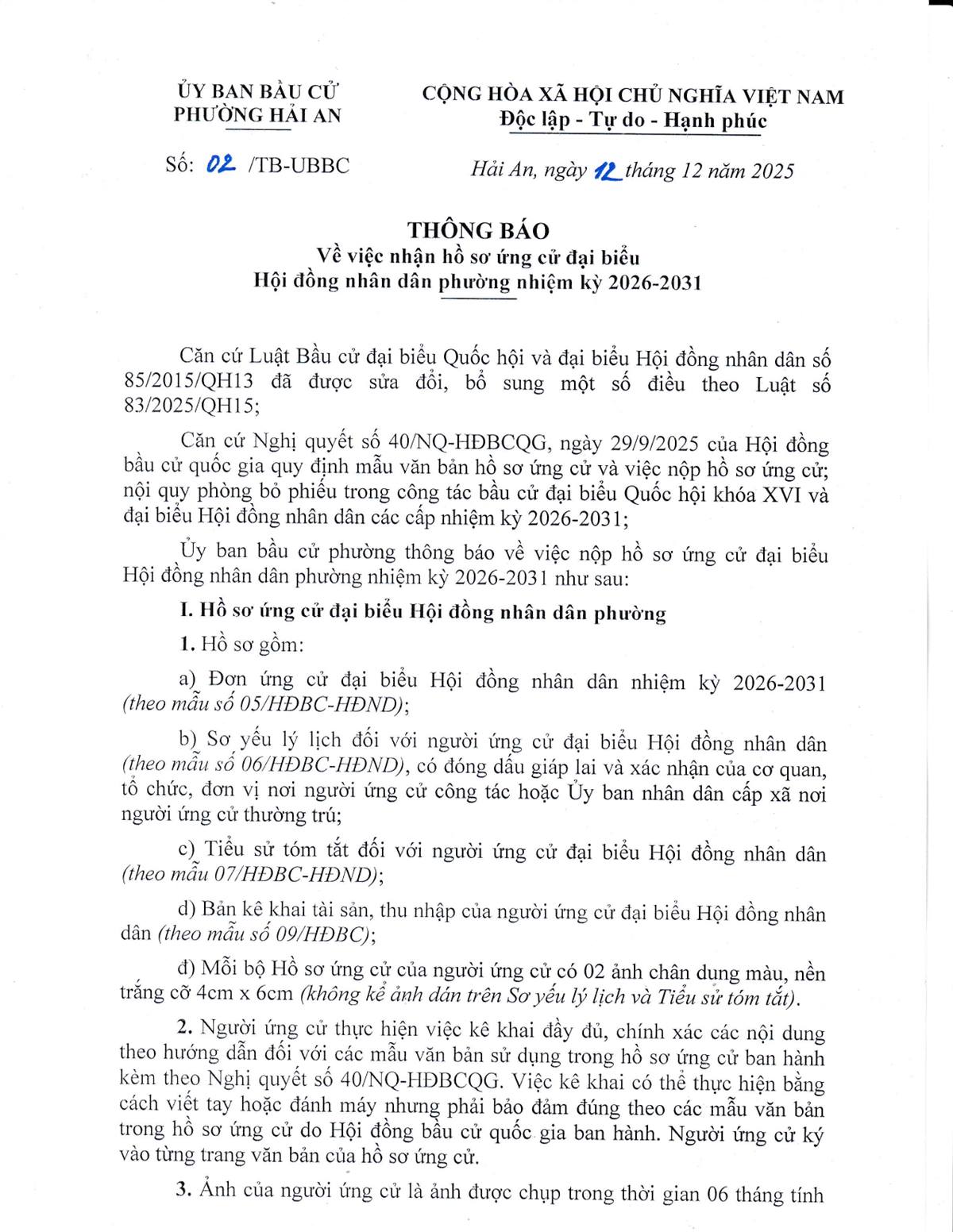 Thông báo về việc nhận hồ sơ ứng cử đại biểu Hội đồng nhân dân phường nhiệm kỳ 2026-2031