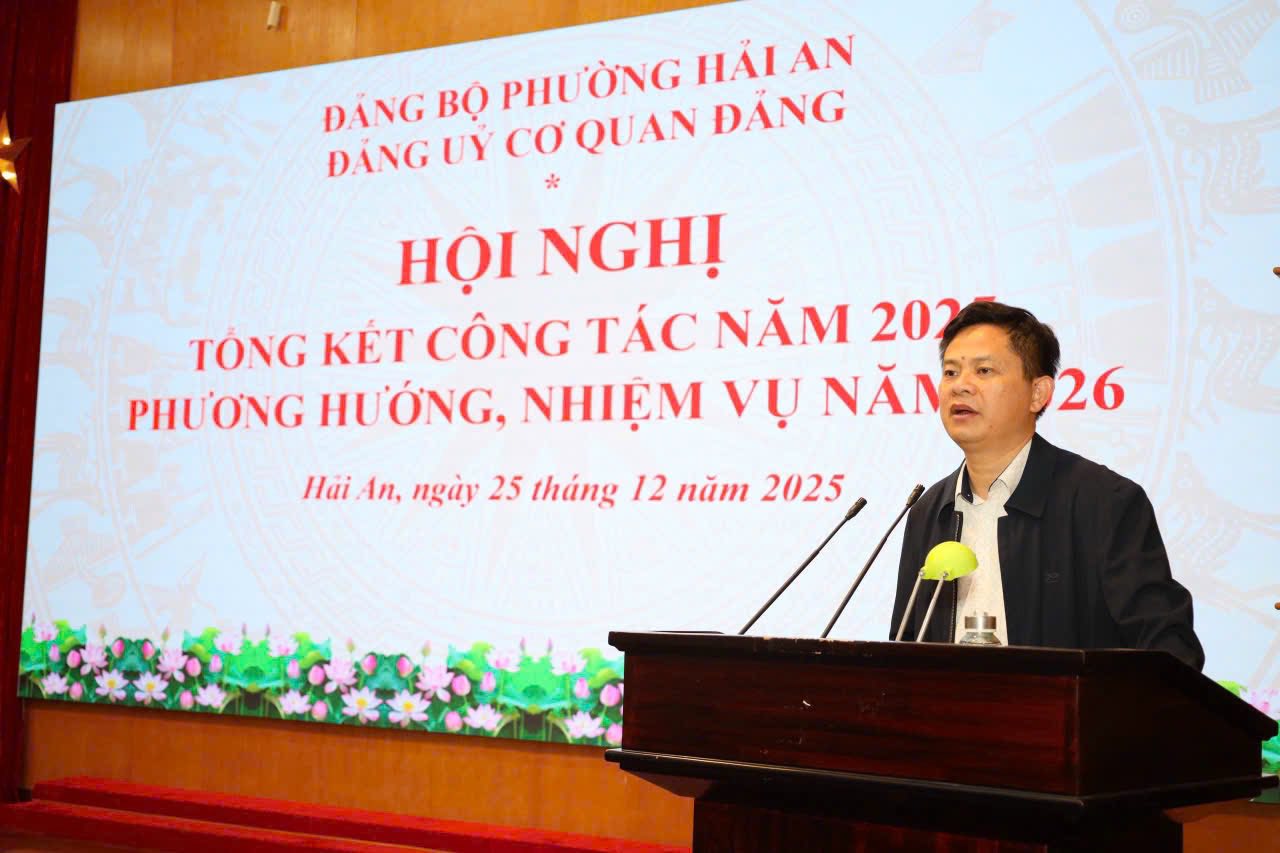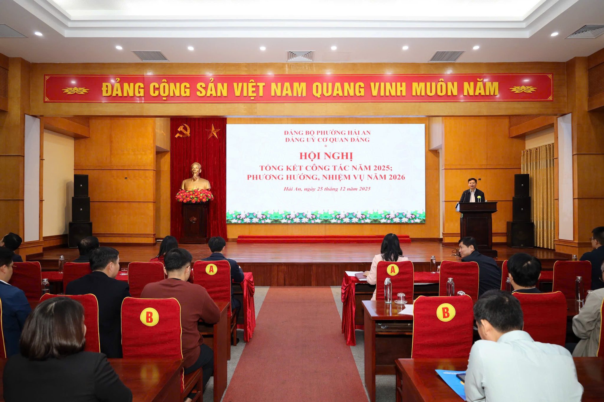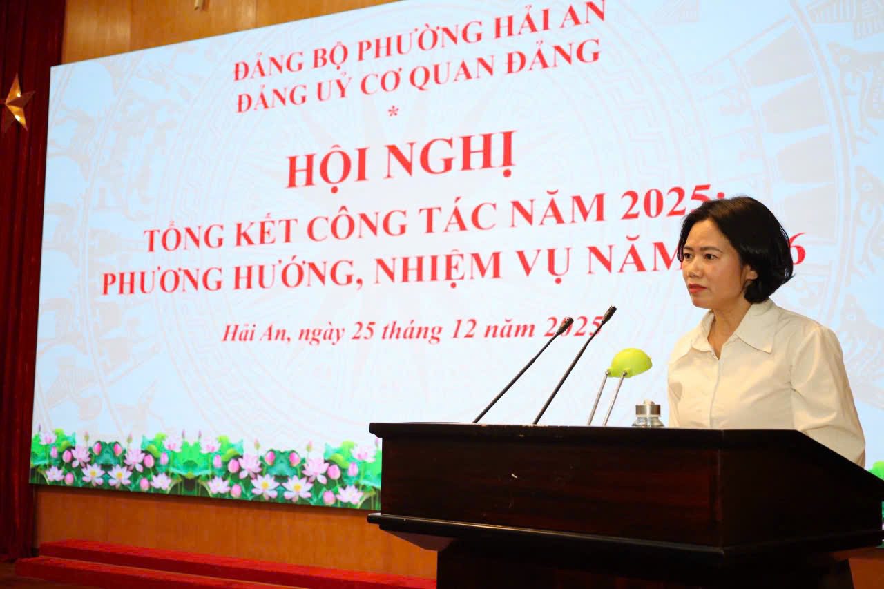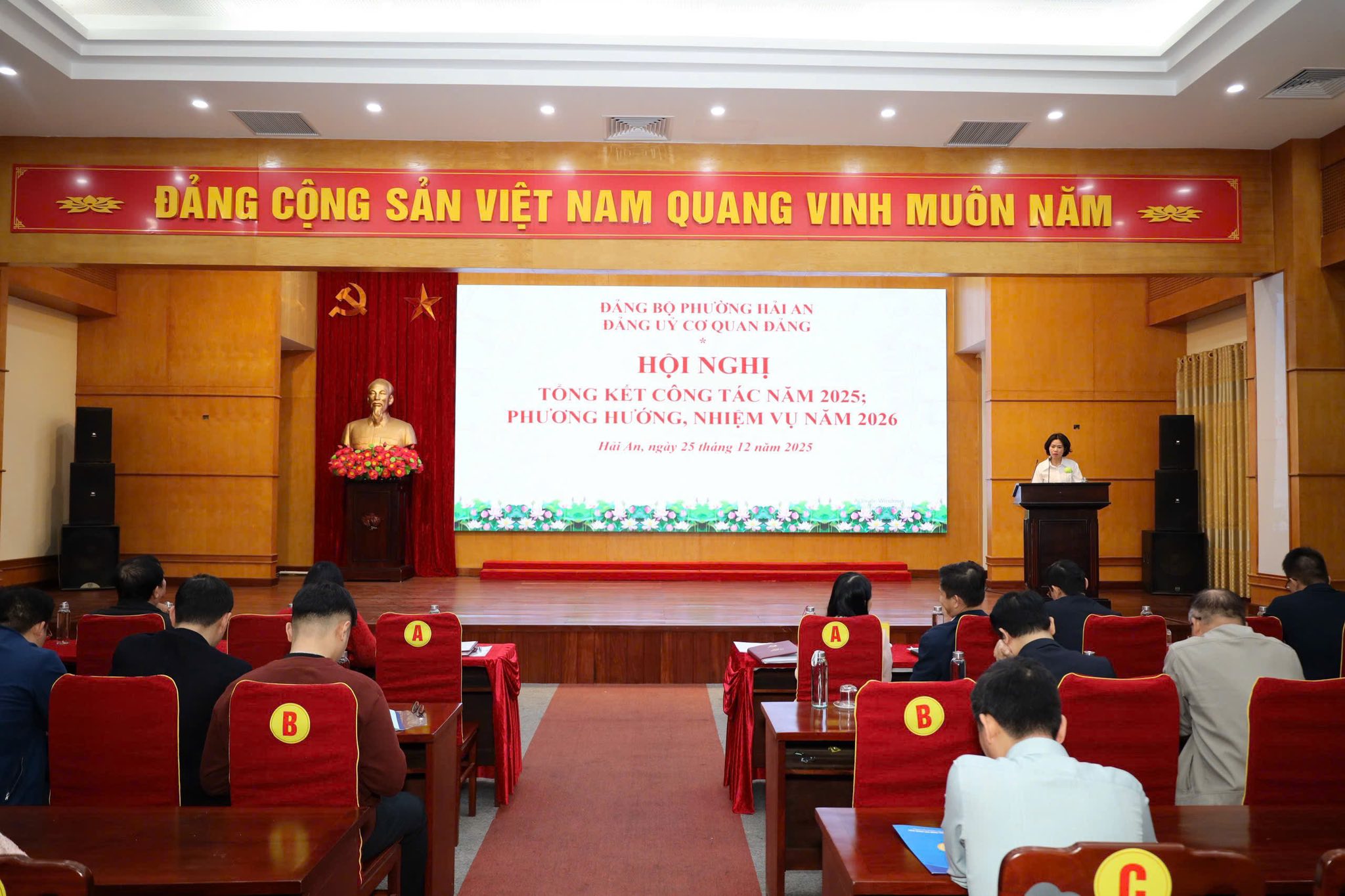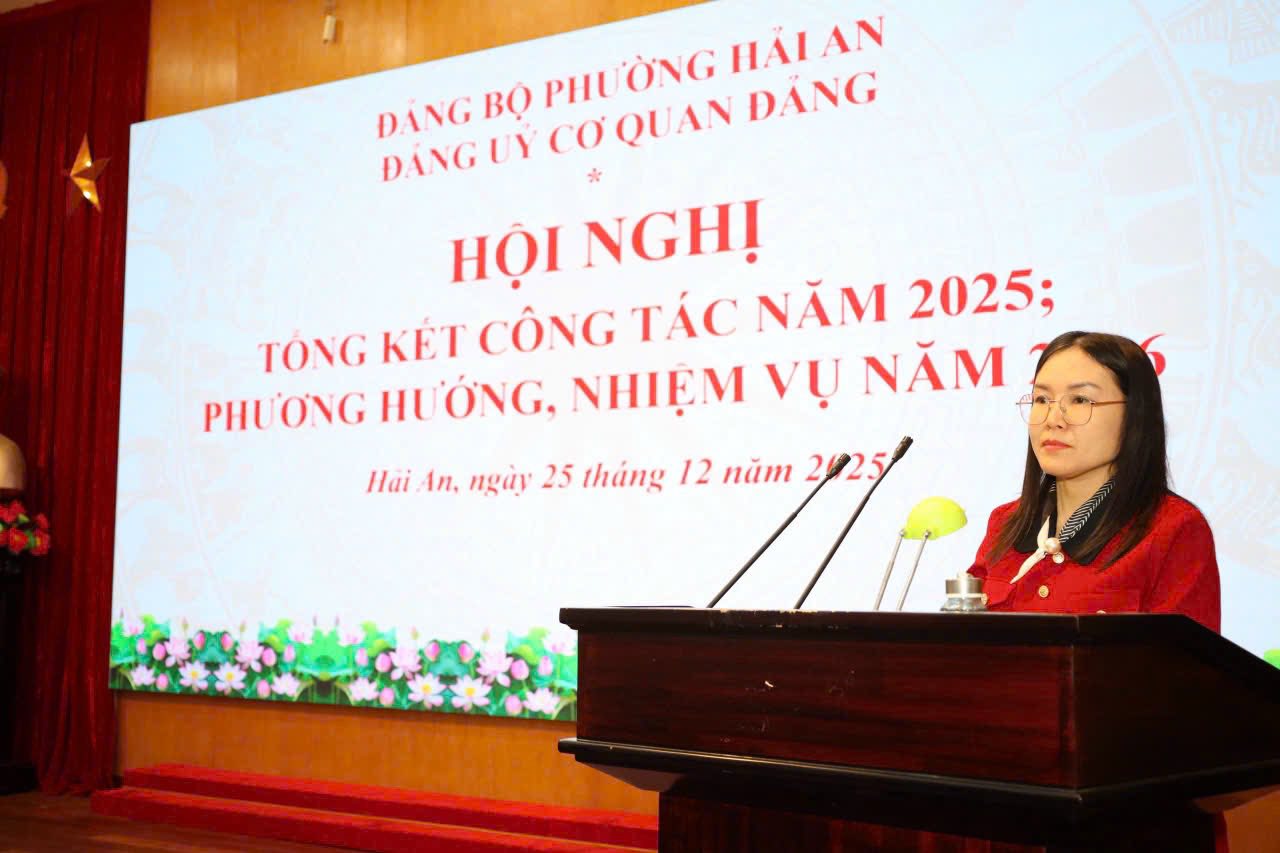 Chiều 25/12/2025, Đảng ủy cơ quan Đảng phường Hải An tổ chức hội nghị tổng kết công tác năm 2025; triển khai phương hướng, nhiệm vụ năm 2026 và khen thưởng các tập thể, cá nhân có thành tích tiêu biểu. Tham dự Hội nghị có đồng chí Phạm Thị Chuyên - Phó Bí thư Thường trực Đảng ủy phường, các đồng chí trong Ban chấp hành Đảng bộ cơ quan Đảng và toàn thể các chi bộ trực thuộc.