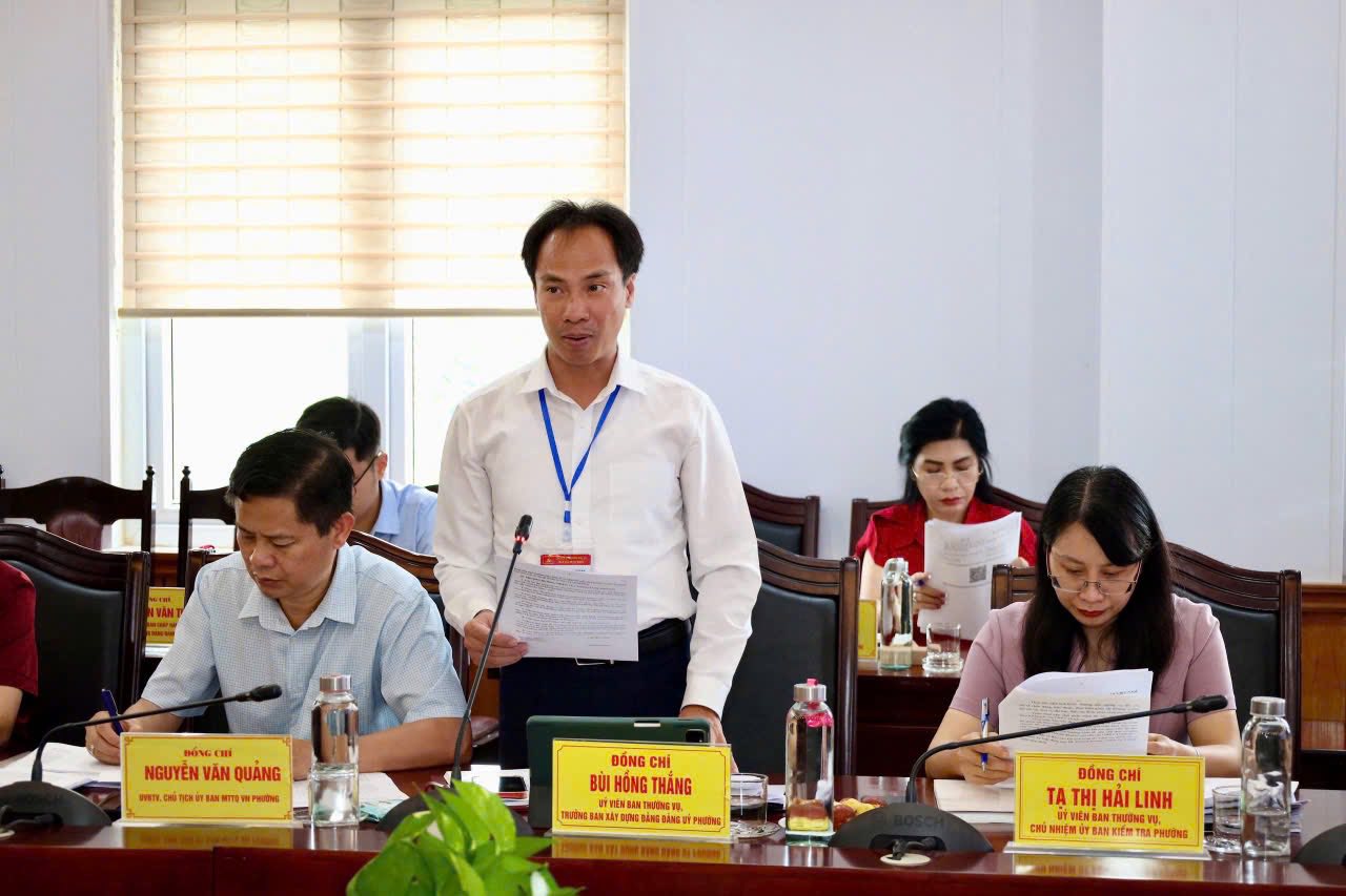 Đồng chí Nguyễn Thị Thu - Uỷ viên Thành uỷ, Bí thư Đảng uỷ, Chủ tịch HĐND phường chủ trì Hội nghị. Cùng dự có: đồng chí Phạm Thị Chuyên - Phó Bí thư Thường trực Đảng uỷ, đồng chí Cao Huy Hiếu - Phó Bí thư Đảng uỷ, Chủ tịch UBND phường; các đồng chí Ủy viên Ban Thường vụ, Uỷ viên Ban Chấp hành Đảng uỷ phường và đại diện lãnh đạo các phòng, ban, đơn vị liên quan.
