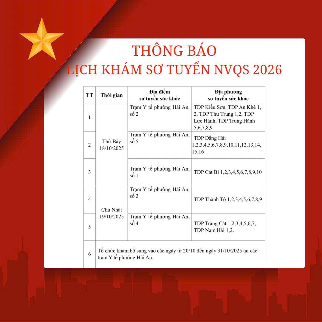 Căn cứ Kế hoạch số 116/KH-UBND ngày 30/9/2025 của UBND phường Hải An. Phường Hải An thông báo lịch sơ tuyển sức khỏe nghĩa vụ quân sự cho công dân gọi nhập ngũ và thực hiện nghĩa vụ tham gia công an nhân dân năm 2026.