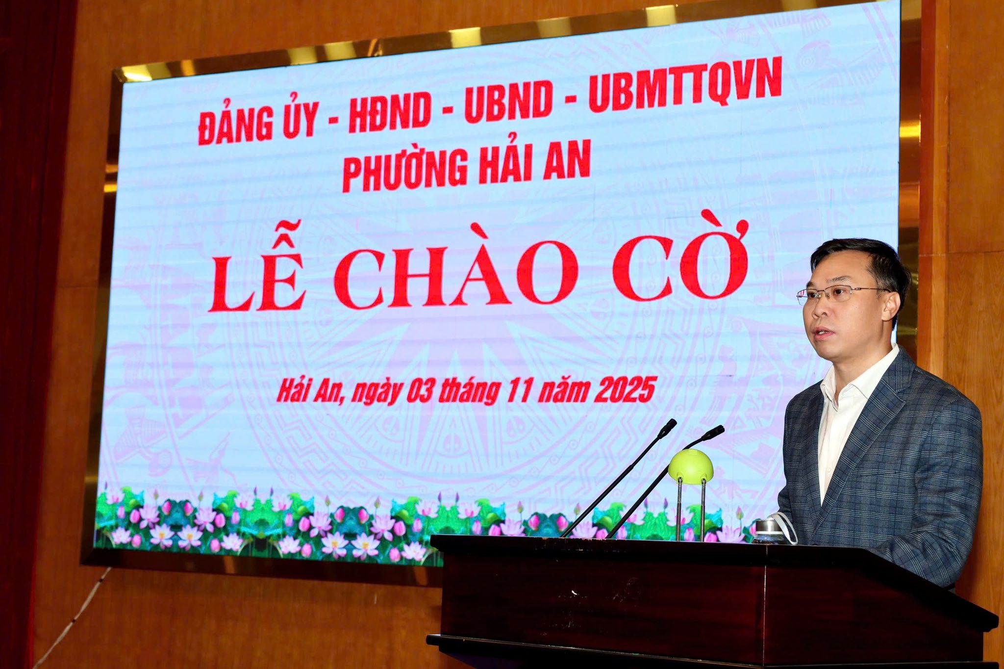Tại buổi Lễ, đồng chí Chủ tịch UBND phường đã thông tin khái quát kết quả thực hiện nhiệm vụ công tác tháng 10, đồng thời đề ra phương hướng, nhiệm vụ trọng tâm trong tháng 11/2025. Phát huy những kết quả đạt được, đồng chí tin tưởng tập thể cán bộ, công chức, viên chức phường sẽ tiếp tục nêu cao tinh thần đoàn kết, trách nhiệm, hoàn thành tốt các nhiệm vụ được giao, góp phần xây dựng phường Hải An ngày càng văn minh, hiện đại.