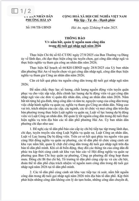 Phường Hải An thông báo lịch sơ tuyển sức khỏe nghĩa vụ quân sự cho công dân gọi nhập ngũ và thực hiện nghĩa vụ tham gia công an nhân dân năm 2026.