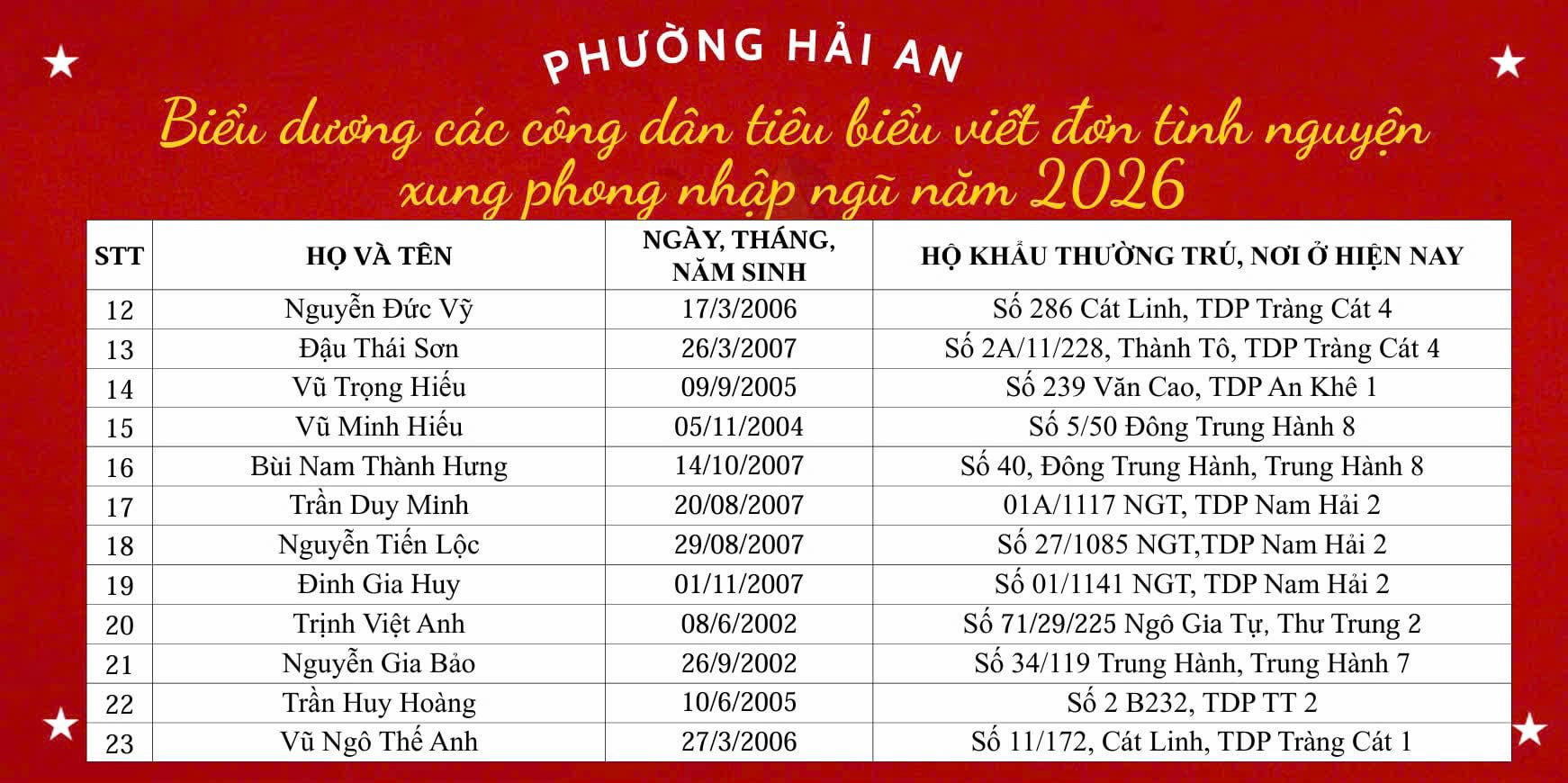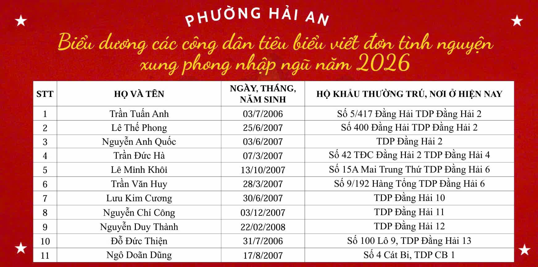 Phường Hải An có 23 công dân tiêu biểu viết đơn tình nguyện xung phong nhập ngũ, thể hiện ý chí, tinh thần trách nhiệm và niềm tự hào được cống hiến sức trẻ cho Tổ quốc. Đây đều là những thanh niên có sức khỏe, phẩm chất đạo đức tốt, tích cực tham gia các phong trào tại địa phương, là tấm gương sáng cho đoàn viên, thanh niên noi theo.
