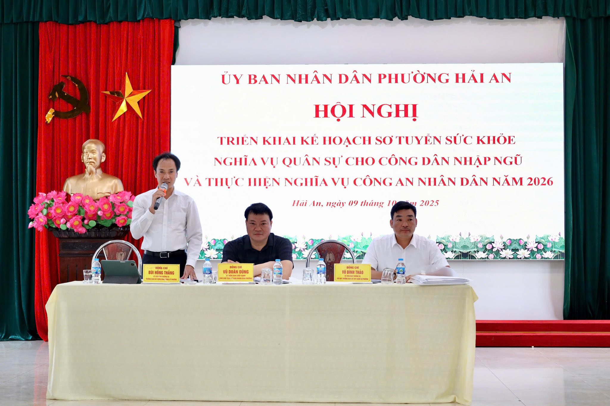 Chiều ngày 9/10/2025, UBND phường Hải An tổ chức Hội nghị triển khai kế hoạch sơ tuyển sức khỏe nghĩa vụ quân sự cho công dân gọi nhập ngũ và thực hiện nghĩa vụ Công an nhân dân năm 2026.
