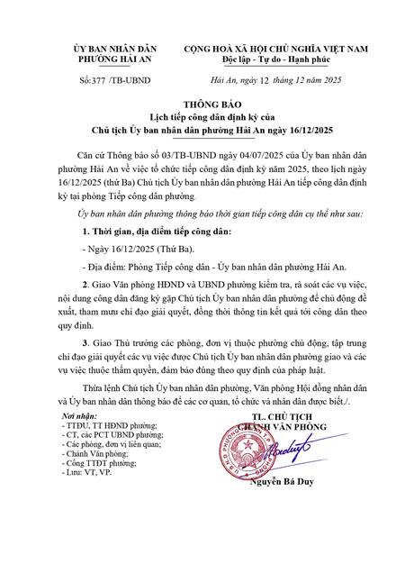 THÔNG BÁO Lịch tiếp công dân định kỳ của Chủ tịch Ủy ban nhân dân phường Hải An ngày 09/12/2025