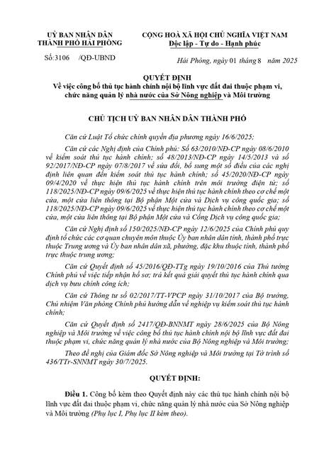 Công bố thủ tục hành chính nội bộ lĩnh vực đất đai thuộc phạm vi, chức năng quản lý nhà nước của Sở Nông nghiệp và Môi trường.