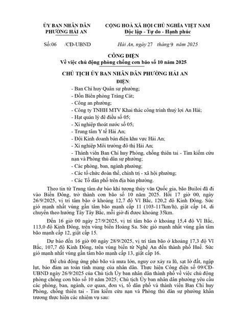 Phương Án của BCH phòng chống thiên tai, tìm kiếm cứu nạn, phòng thủ dân sự phường Hải An ứng phó bão số 9, năm 2025