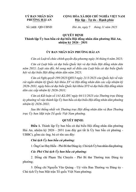 QUYẾT ĐỊNH Thành lập Ủy ban bầu cử đại biểu Hội đồng nhân dân phường Hải An, nhiệm kỳ 2026 - 2031