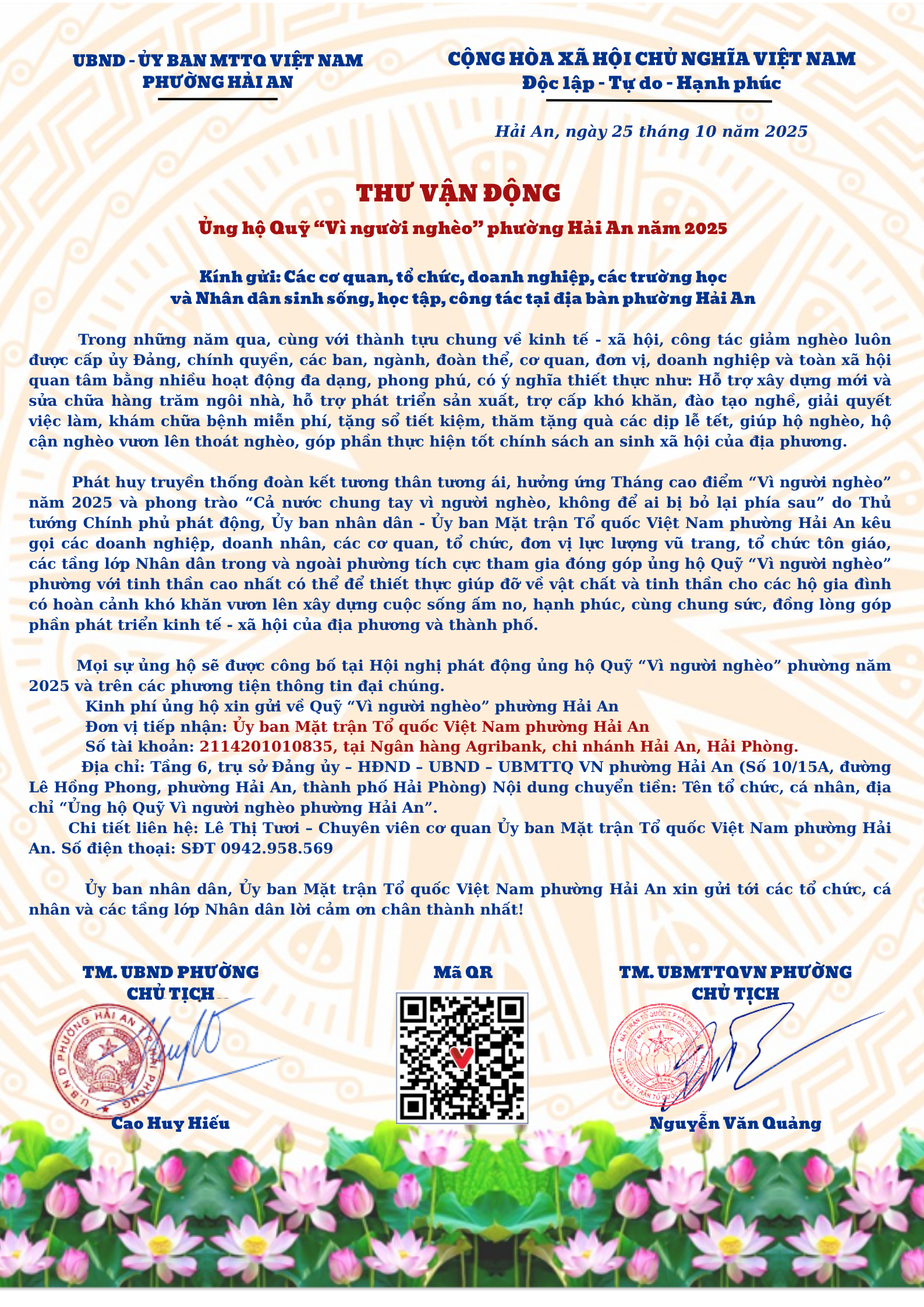 Thư vận động ủng hộ quỹ vì người nghèo phường Hải An năm 2025