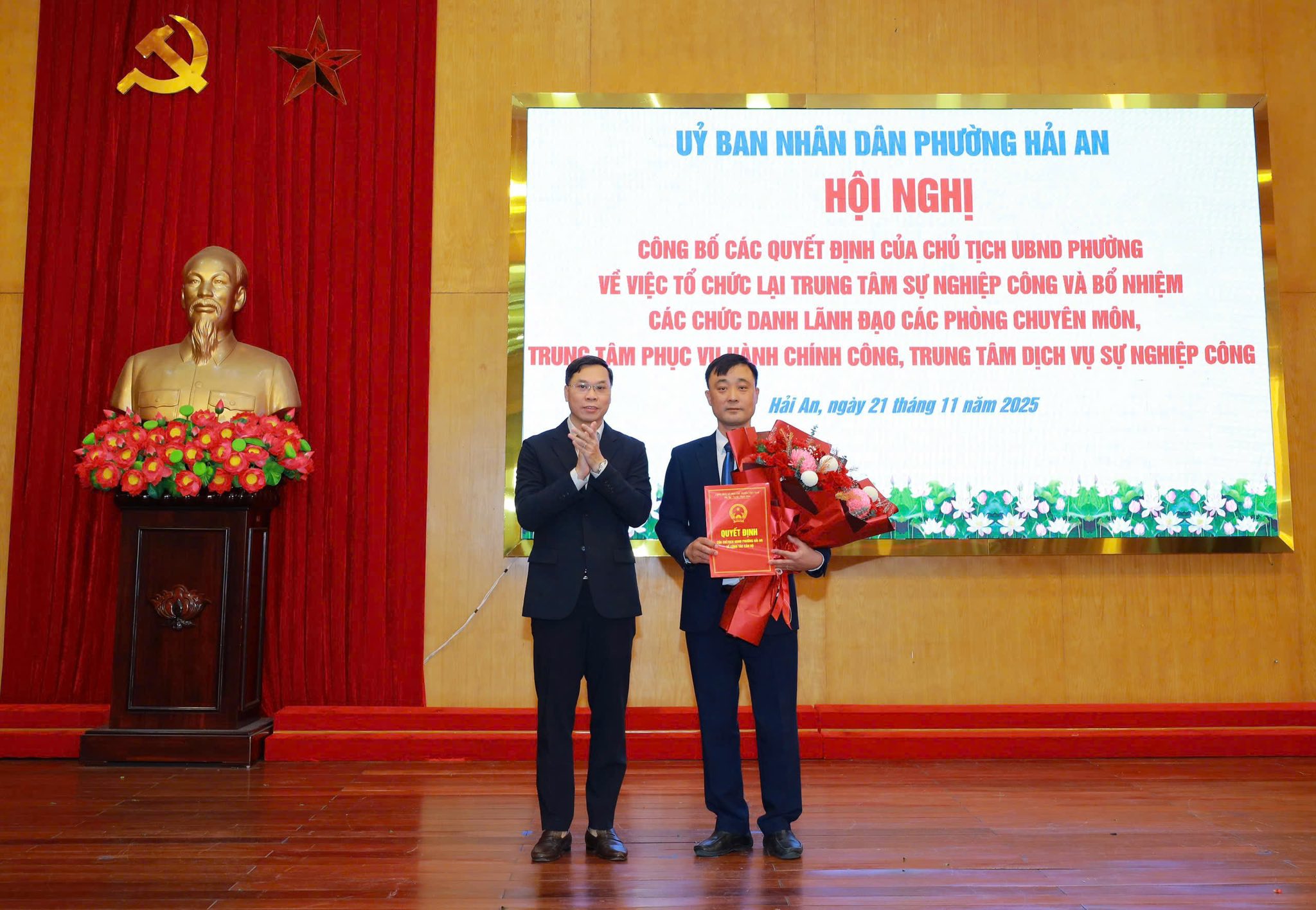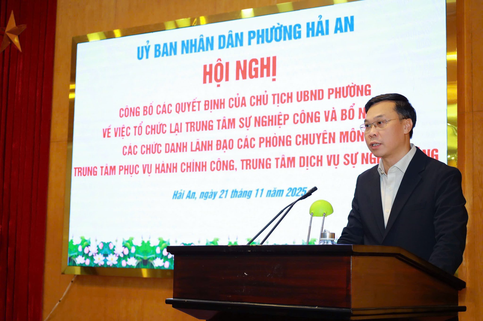 Sáng ngày 21/11/2025, UBND phường Hải An tổ chức Hội nghị công bố các quyết định của Chủ tịch UBND phường về việc tổ chức lại Trung tâm Sự nghiệp công và bổ nhiệm các chức danh lãnh đạo các phòng chuyên môn, Trung tâm Phục vụ hành chính công, Trung tâm Dịch vụ Sự nghiệp công.