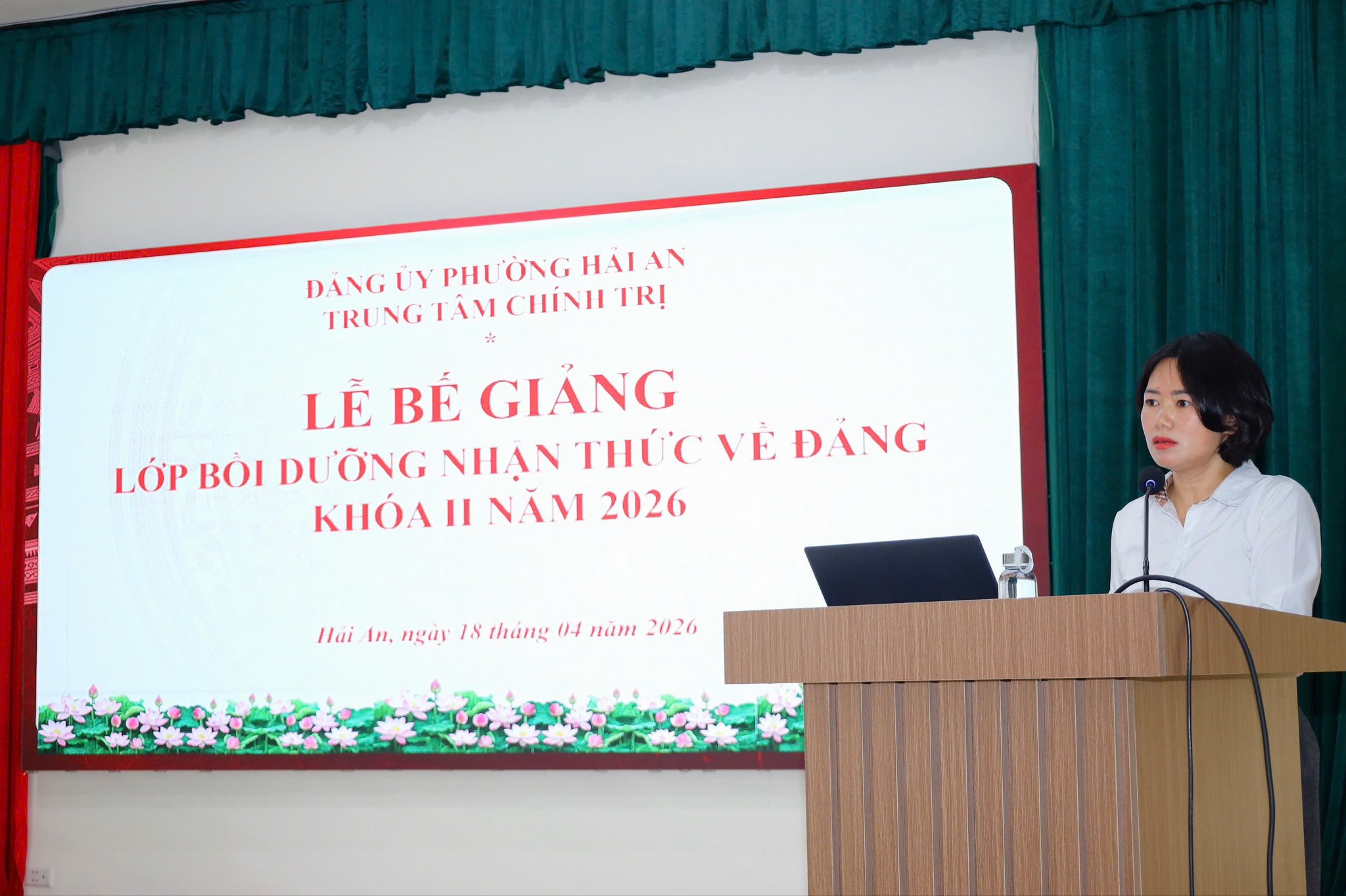 Sáng 18/4, Trung tâm Chính trị phường Hải An tổ chức Lễ bế giảng lớp Bồi dưỡng nhận thức về Đảng khóa II năm 2026. Tham dự buổi lễ có đồng chí đồng chí Tạ Thị Hải Linh - UVBTV, Chủ nhiệm UBKT Đảng ủy phường; đồng chí Đào Thị Thanh Phương - ĐUV, Giám đốc Trung tâm Chính trị phường Hải An; cùng các đồng chí đại diện lãnh đạo Ban xây dựng Đảng phường Hải An, trường học.