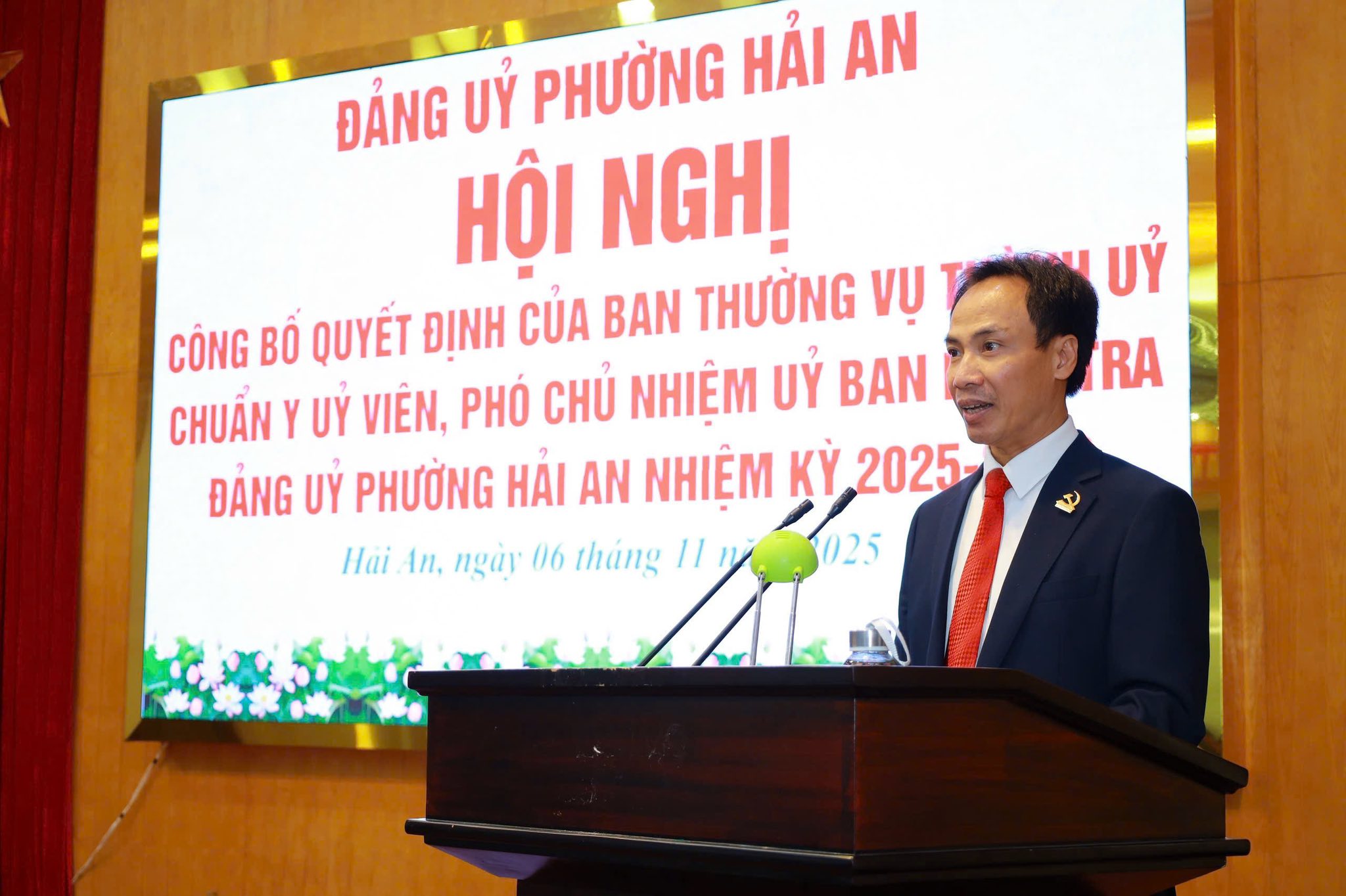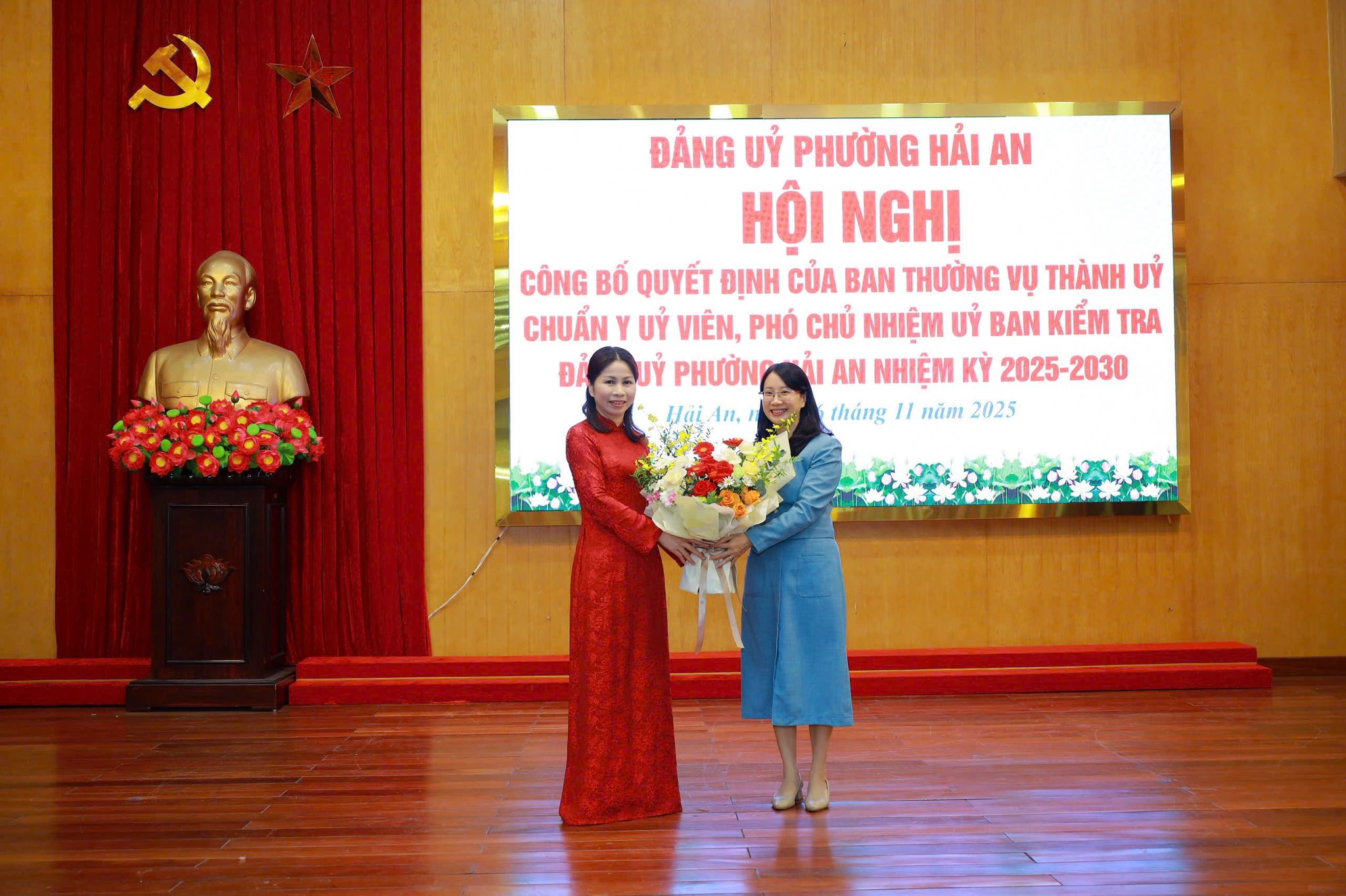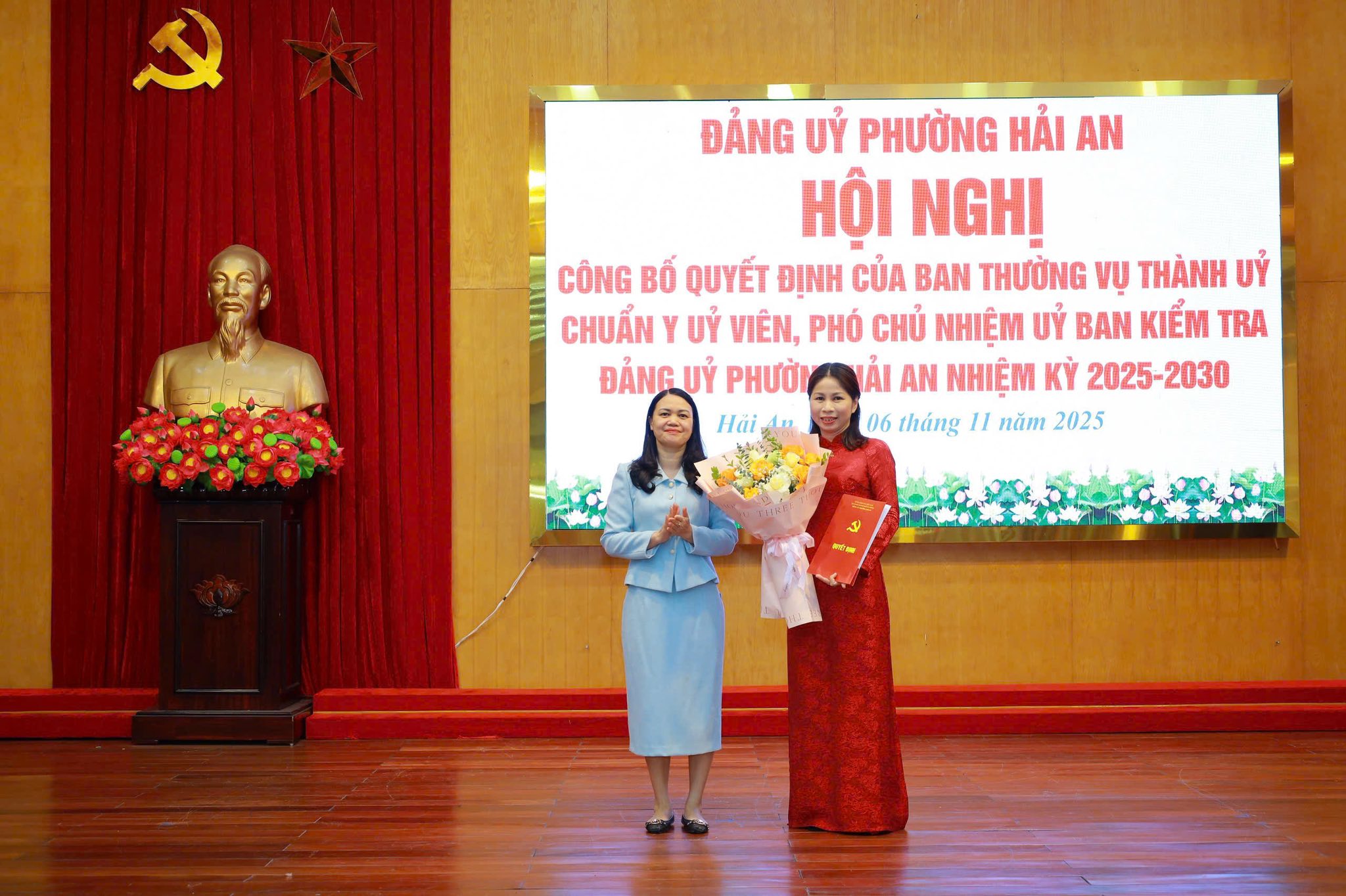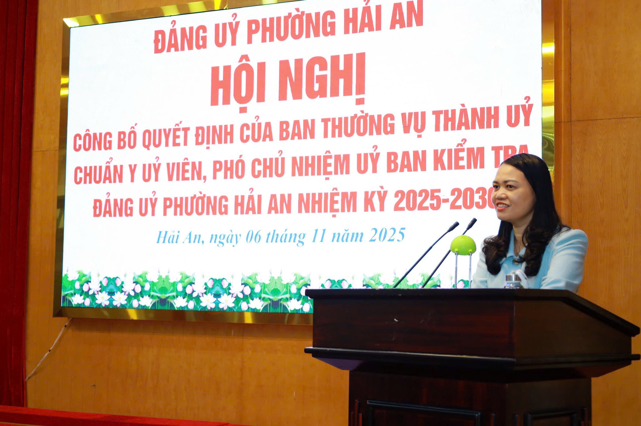 Sáng ngày 06/11/2025, Đảng uỷ phường Hải An tổ chức hội nghị công bố quyết định của Ban Thường vụ Thành uỷ chuẩn y Uỷ viên, Phó Chủ nhiệm Uỷ ban Kiểm tra Đảng uỷ phường Hải An nhiệm kỳ 2025-2030 đối với đồng chí Trần Thị Thu Trang - Phó Trưởng phòng Kinh tế, Hạ tầng và Đô thị phường.
