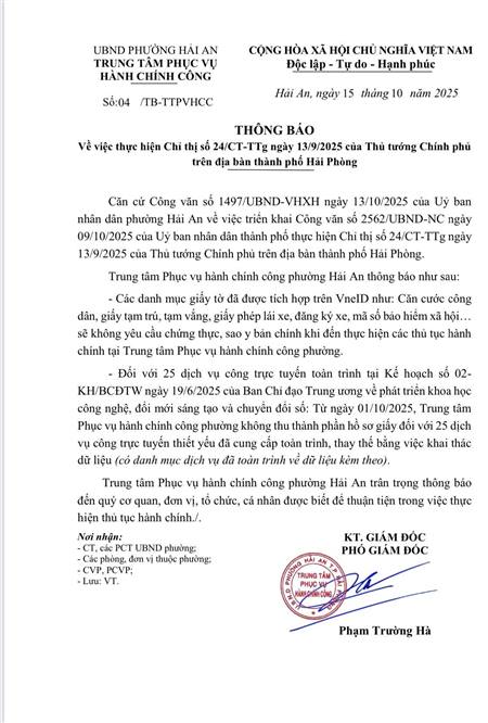 Thông báo về việc thực hiện Chỉ thị số 24/CT-TTg ngày 13/9/2025 của Thủ tướng Chính phủ trên địa bàn thành phố Hải Phòng